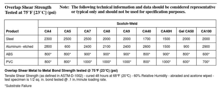 以粘性而言,3M 超能胶其实是超级牛,从下图官方提供的材料来看,CA40H 在铝合金材质上,强度可以达到 2600psi,相当于 179 公斤 / 厘米²。