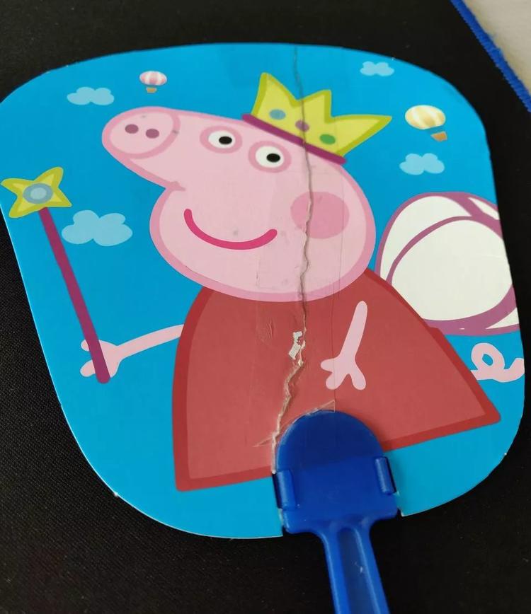 下图是女儿很喜欢的一个小猪佩奇的扇子,因为材质是卡纸,所以不小心被撕坏了——在没找到替代品前,想的是修补下。