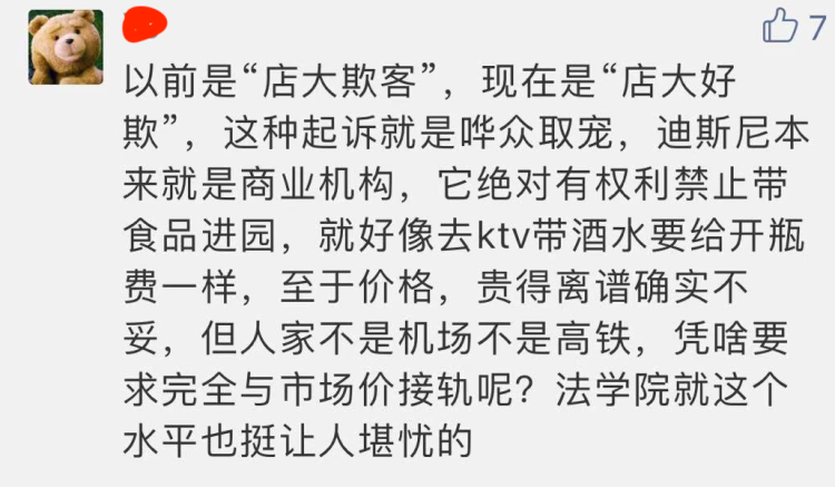 当然,也有网友认为,迪士尼的做法有道理,游客自带食品入园可能会造成园区垃圾增多,垃圾乱扔的情况。还有游客举例说,此前迪士尼允许游客带食品的时候,有的游客带了方便面,在乐园的餐厅不停地接热水,而迪士尼的餐厅其实只提供给有冲泡奶粉需要的游客热水,这些带方便面的游客占了餐厅位置,造成正常就餐的游客没有位置可坐。