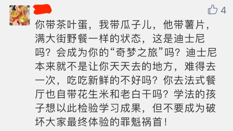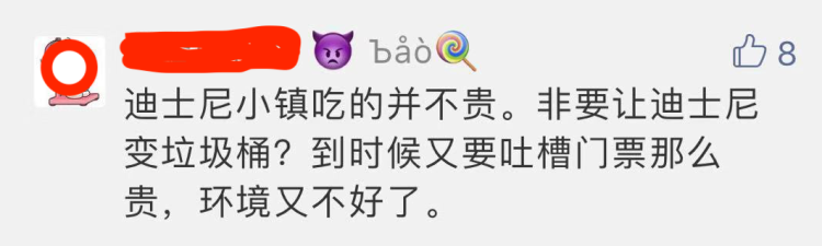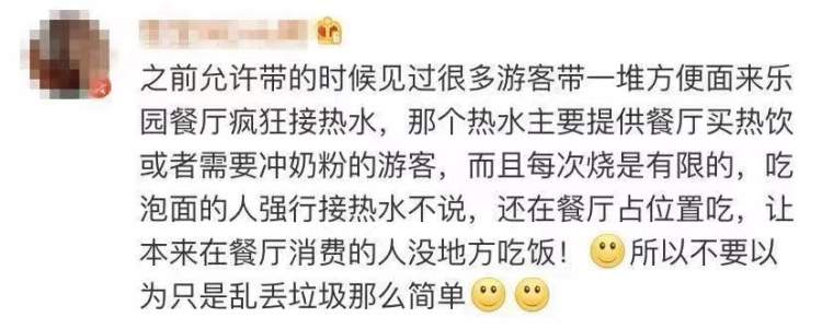 还有一点,自带食品吃完后会产生大量的干湿垃圾,很可能会出现垃圾随地乱扔或者不分类乱扔现象,也会极大影响到乐园的游园环境。尤其目前上海对垃圾分类管理趋严的情况下,无疑会增加乐园的运营成本。