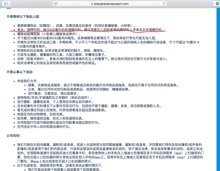 ■上海迪士尼度假区关于不得携带食品进入乐园的规定。