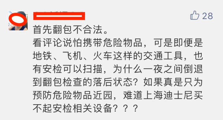 还有网友认为,迪士尼工作人员翻游客的包进行检查是违法的。