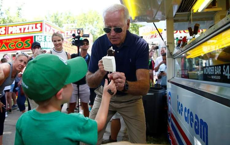 美国前副总统拜登给自己买了一个冰激凌,也没忘记给旁边的小男孩买一个……