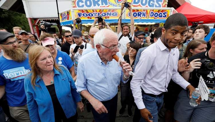 伯尼•桑德斯在照相机的追逐下,吃起了玉米热狗,并对玉米热狗连连夸赞“非常好”……