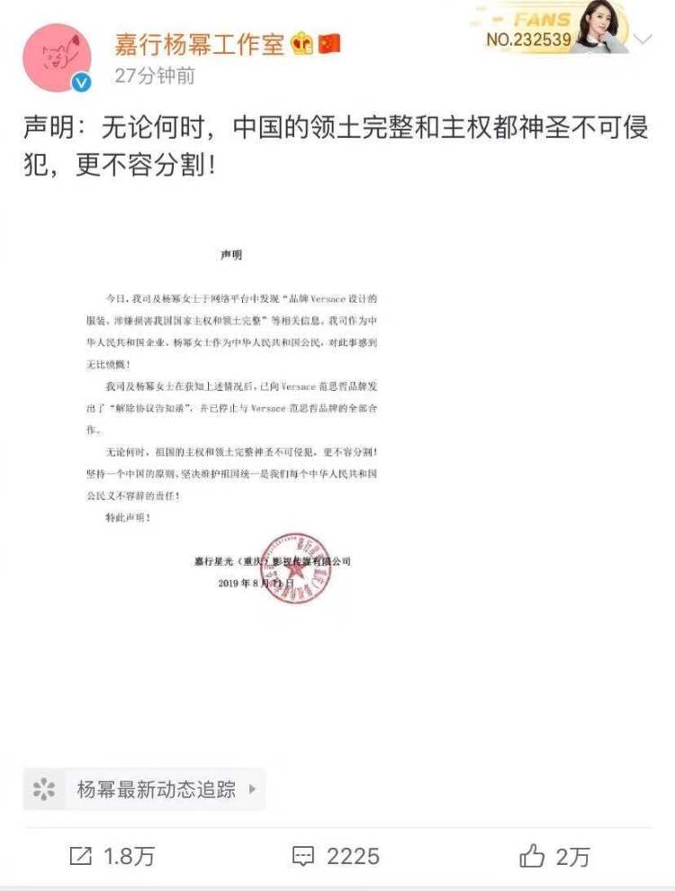 对此范思哲(VERSACE)在微博、ins上发表了道歉声明。