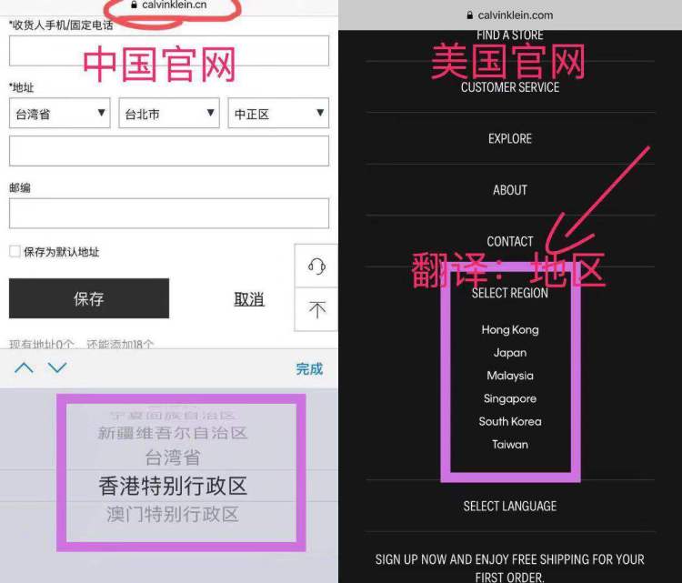 而CALVIN KLEIN则被网友发现虽然中国官网上香港是特别行政区,但是在美国官网上将香港和台湾列在国家列表里。