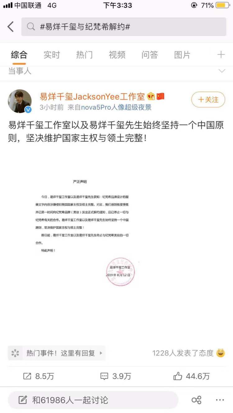 易烊千玺作为纪梵希(彩妆)的代言人,虽不是纪梵希成衣的品牌代言人但是同属LVMH集团,易烊千玺还是宣布解约,国家主权高于一切!
