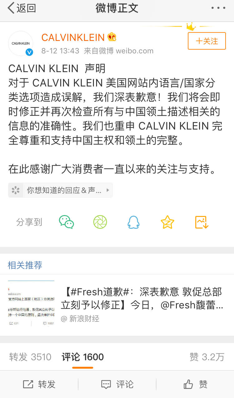 CALVIN KLEIN今日下午在微博上道歉。