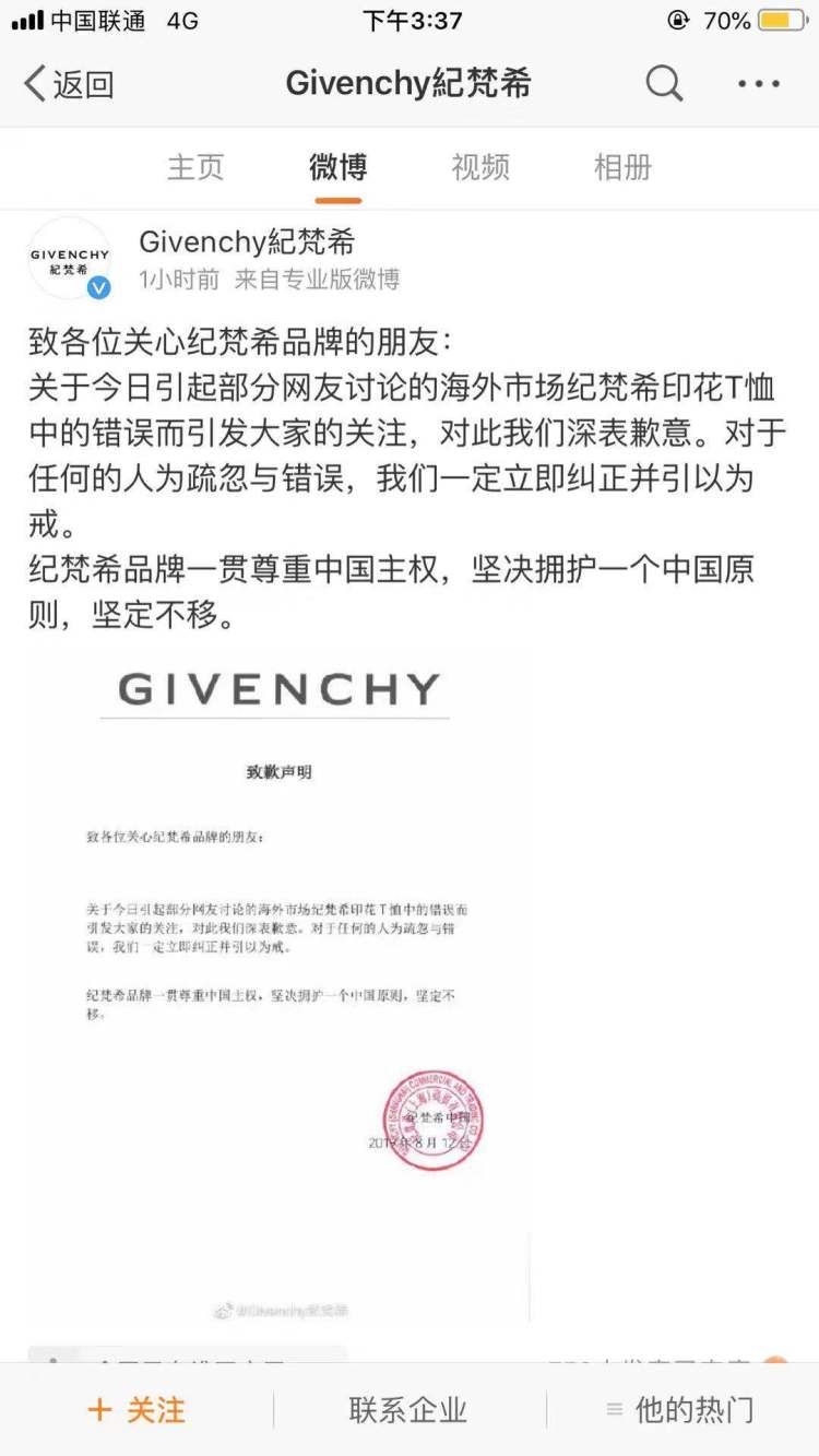 纪梵希(GIVENCHY)随后在微博、ins上发表了道歉声明。
