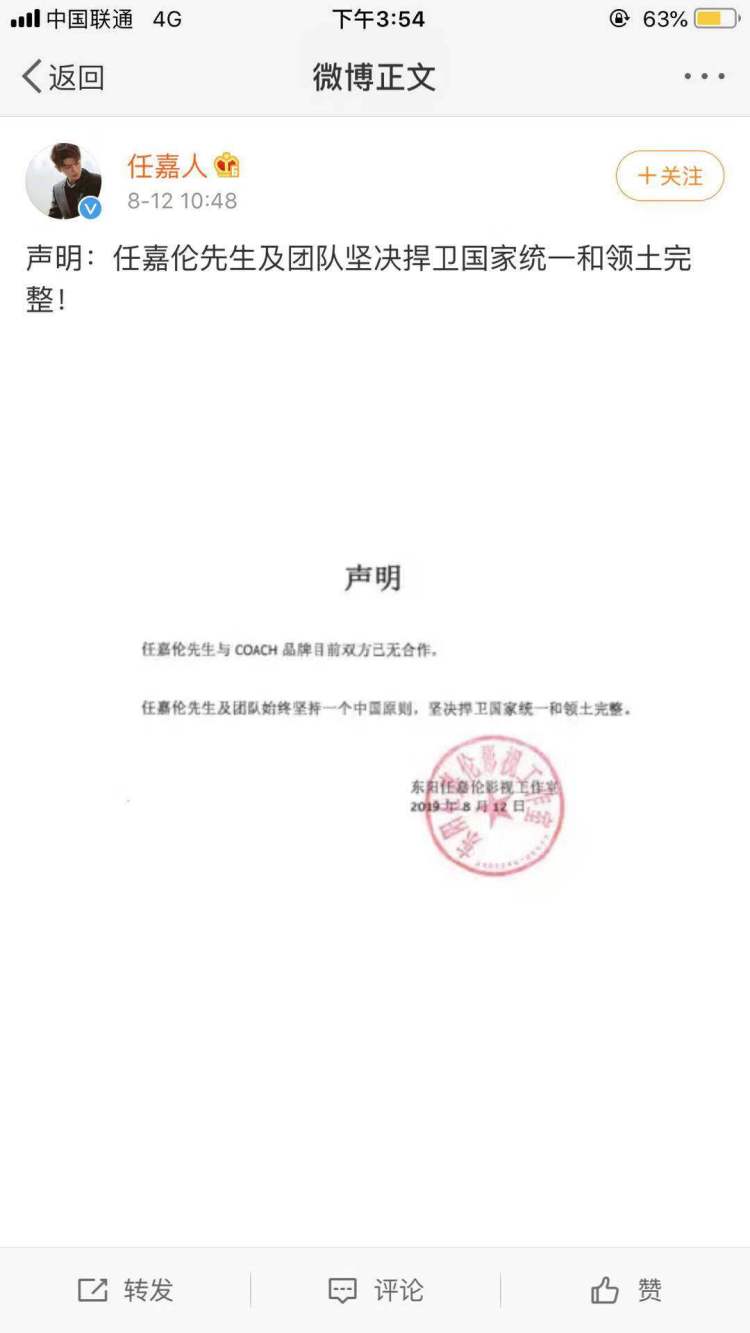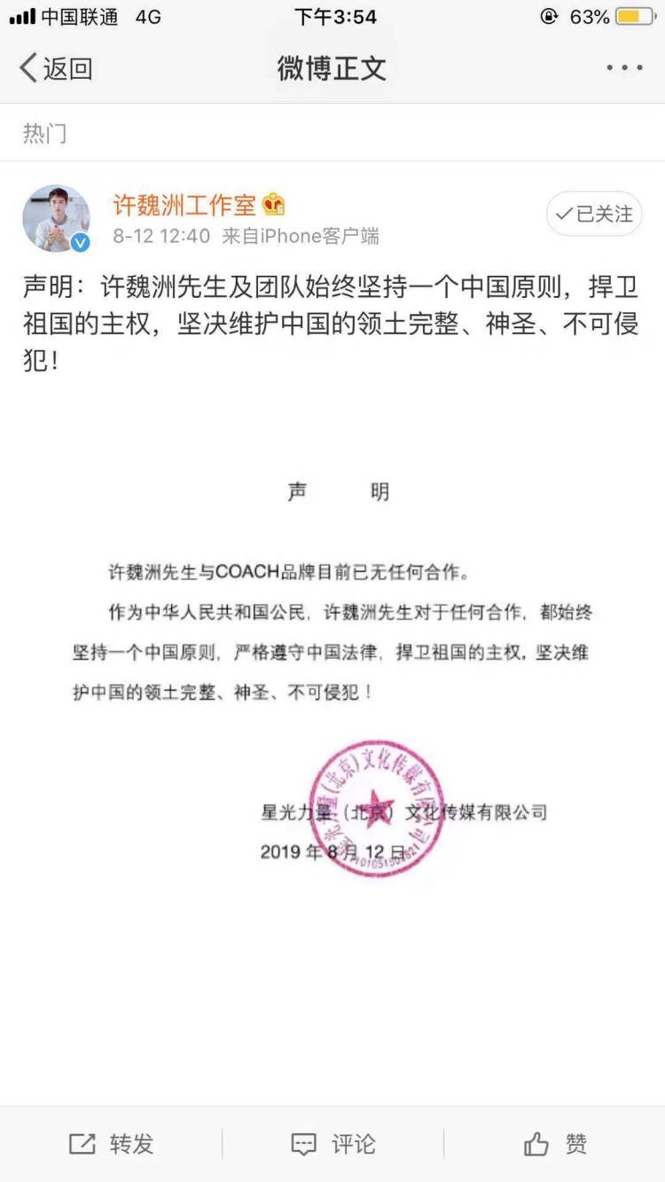 随后蔻驰(COACH)的 其他代言人关晓彤,许魏洲,任嘉伦也相继发表声明,表示维护国家领主主权的立场。
