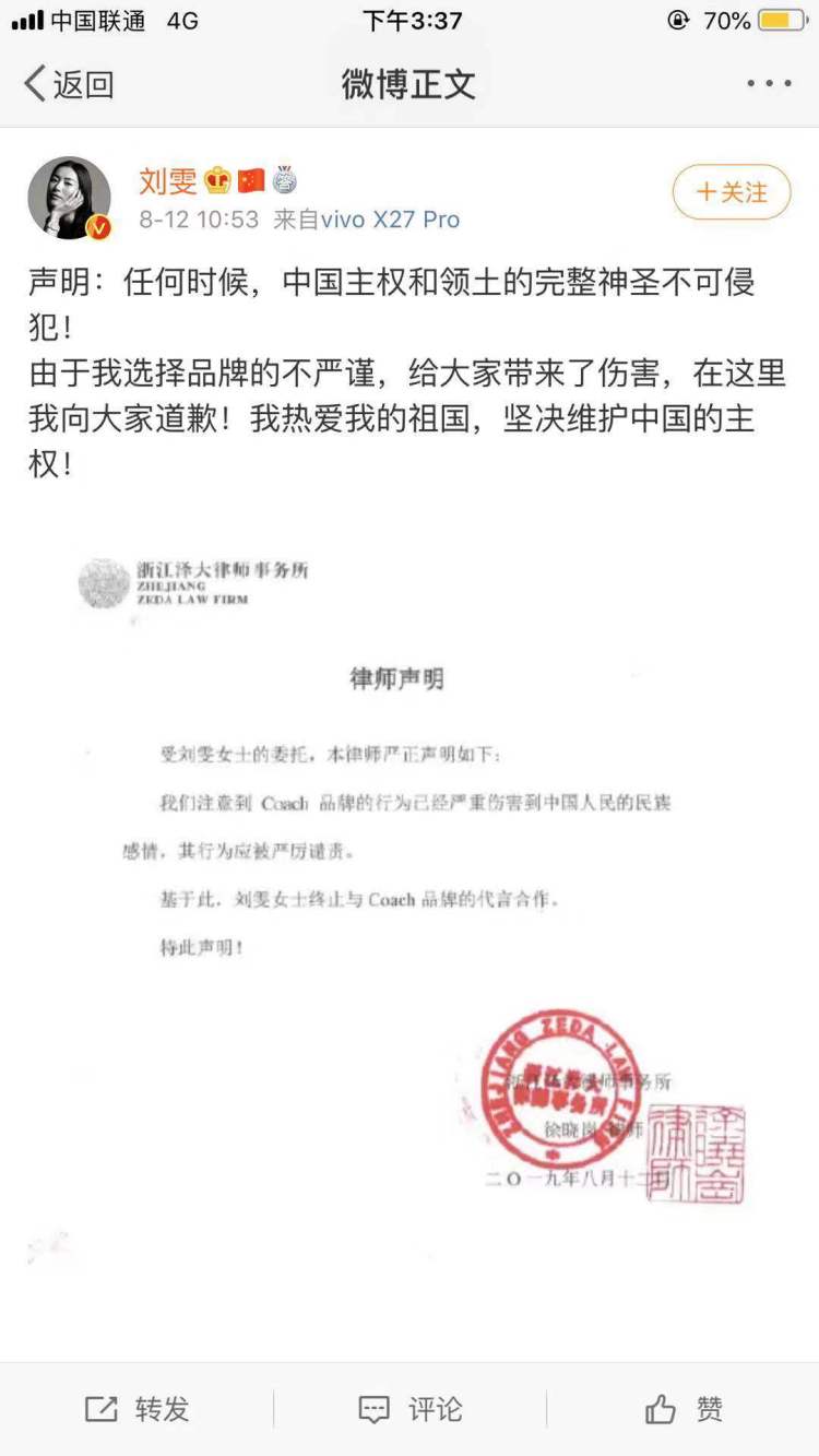 此事一出,蔻驰(COACH)的官方代言人刘雯立刻发出了解约声明,表示坚决维护中国的主权!