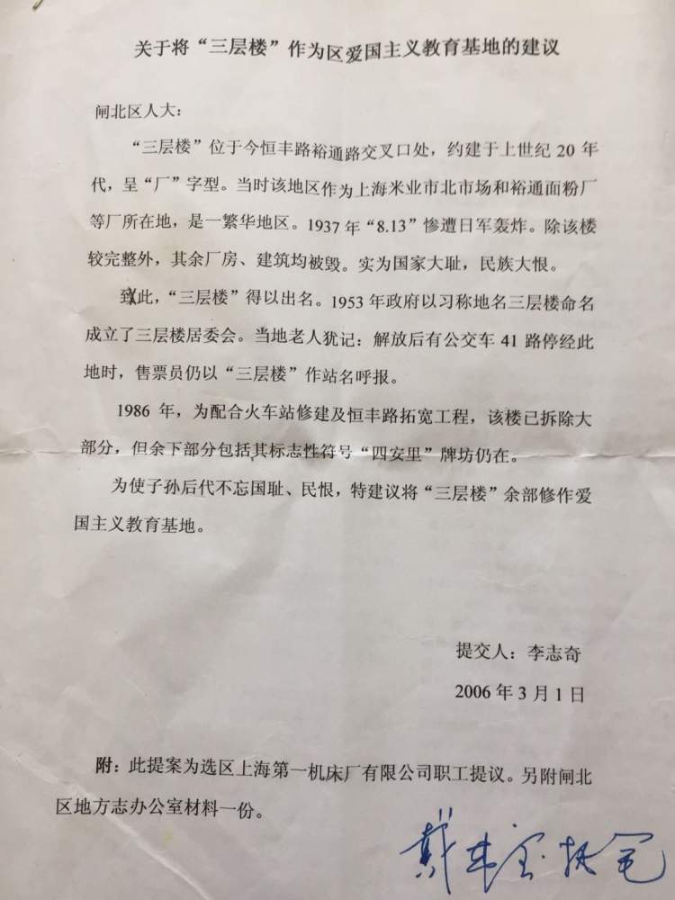 我建言保留三层楼的事,是在2006年。我当时是上海第一机床厂办公室的一名干事。在2006年大约年初时,一次工作会议后,我被时任厂党委副书记李志奇单独留下,他是原闸北区人大代表,他问我有什么提案能给他送上。