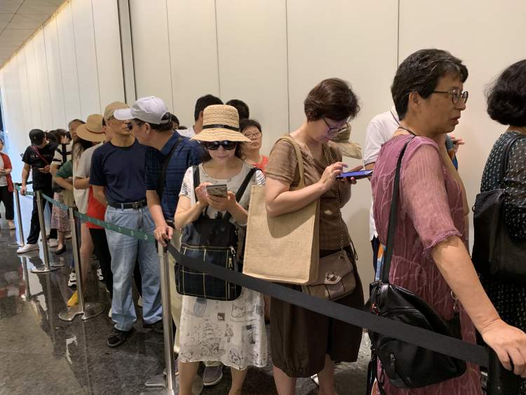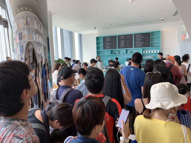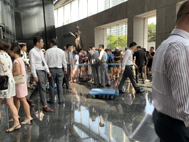 到15:30时,上海中心一楼办公入口的大厅已经排满了人。而在大厅排完了长队,还得去电梯边上排短队伍。队伍边上,竖起了一块牌子,朵云书院旗舰店,预计排队时间:3小时,但即便如此,也没有阻挡观众的热情。