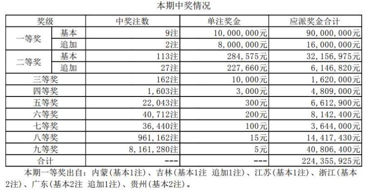 本期全国开出9注一等奖,其中2注为1800万元(含800万元追加奖金)追加投注一等奖,出自吉林和广东;7注为1000万元基本投注一等奖,分落内蒙古(1注)、江苏(1注)、浙江(2注)、广东(1注)和贵州(2注)。