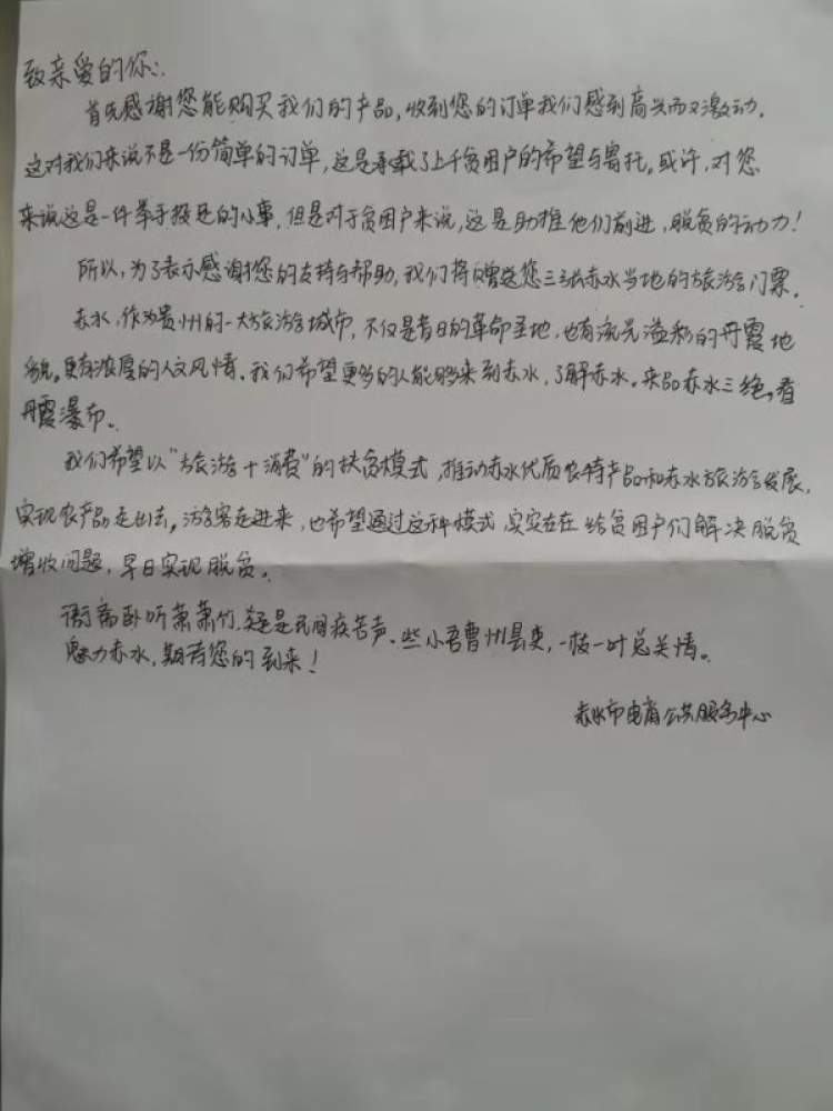 “首先,感谢您能购买我们的产品,收到您的订单,我们感到高兴而又激动。这对我们来说不是一份简单的订单,这是承载了上千贫困户的希望与寄托。或许,对你来说这是一件举手投足的小事,但是这对于贫困户来说,是助推他们前进、脱贫的动力!”