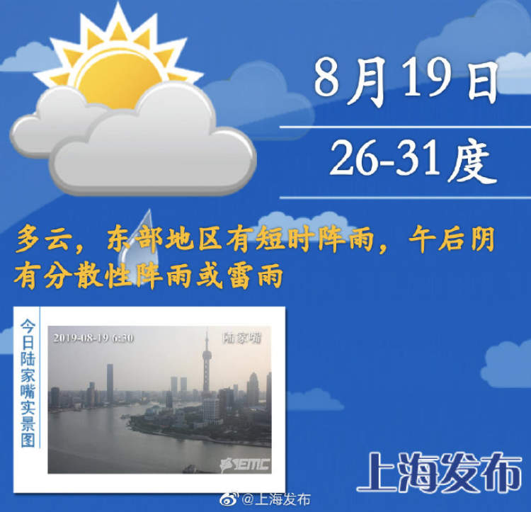 终于舒爽了!本周阵雨或雷雨频袭,今日最高温度31度 周到君 2019-8-19 来源:周到上海 今天申城多云,东部地区有短时阵雨,午后阴有分散性阵雨或雷雨,体感凉爽,最高温度31度!明天本市多云到阴,接下来几天夏日的“雨姑娘”仍光临申城,预计本周二到周五气温略微上升,最高温度徘徊在32-33度。夏天快步入尾声,阵雨仍将频繁光顾魔都,请大家还需随身携带雨具哟~ 来源:周到上海 作者:周到君 赞一个 (0)