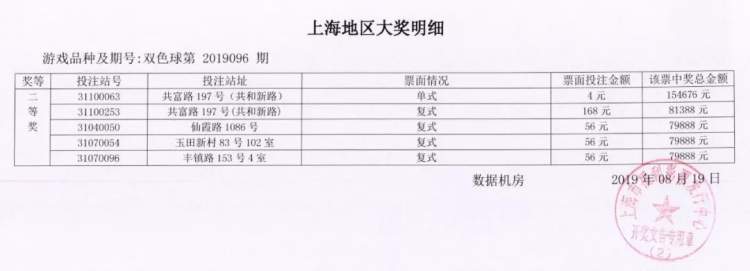 数据显示,上海彩民中得6注二等奖,单注奖金为77338元,彩票分别售出于共富路197号(共和新路)、仙霞路1086号、玉田新村83号102室、丰镇路153号4室福彩销售点。
