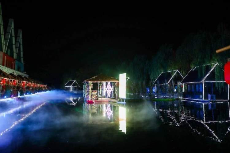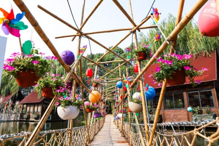 月色中,湖面上清风徐来、水波荡漾。岸边垂柳依依,放眼望去,阡陌纵横,屋宇错落,宛如世外桃源。吊桥“吱吱呀呀”,一步三摇走在吊桥上的游客张晓丽和伙伴们仿佛找回了童年“荡秋千”的味道,她说一行3人是专门来此“尝鲜”的:“这里好吃又好玩,既热闹、又安静,会推荐朋友过来。