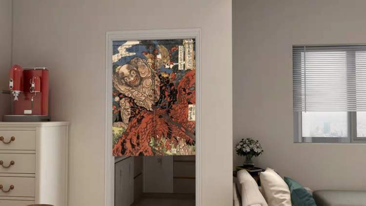 门帘也很有趣。如何让日式的门帘融入中国传统文化的内涵?他们找到了浮世绘歌川派晚期的大师之一歌川国芳的作品——水浒系列的浮世绘。画风威武繁复、细腻浓烈、丝丝入扣,有鲁智深和孙二娘两款图案。