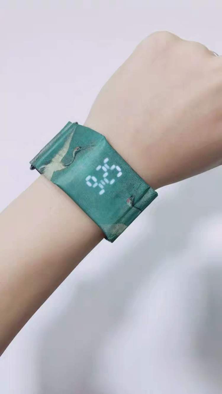 由杜邦纸制成的文创产品与图书一样还是“纸制品”,却因为防水能用于生活中更多场合,出版社似乎都不能抗拒这种诱惑。这款用杜邦纸制成的纸手表,通过LED屏显示,使用年限根据表带的摩擦程度不同而不同,在1-2年之间,有瑞鹤和花间两种花色。