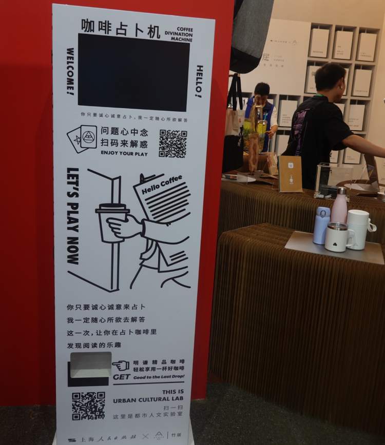 除了这一系列带有纸张褶皱感的包包,“逗好文创”还推出了具有兽面门环冰箱贴、水杯、热水瓶等小东西,并与明谦咖啡合作摆了一台咖啡占卜机——心中念一个问题,机器就会掉出印有作品金句的挂耳咖啡包,这也许能打开你的心结?