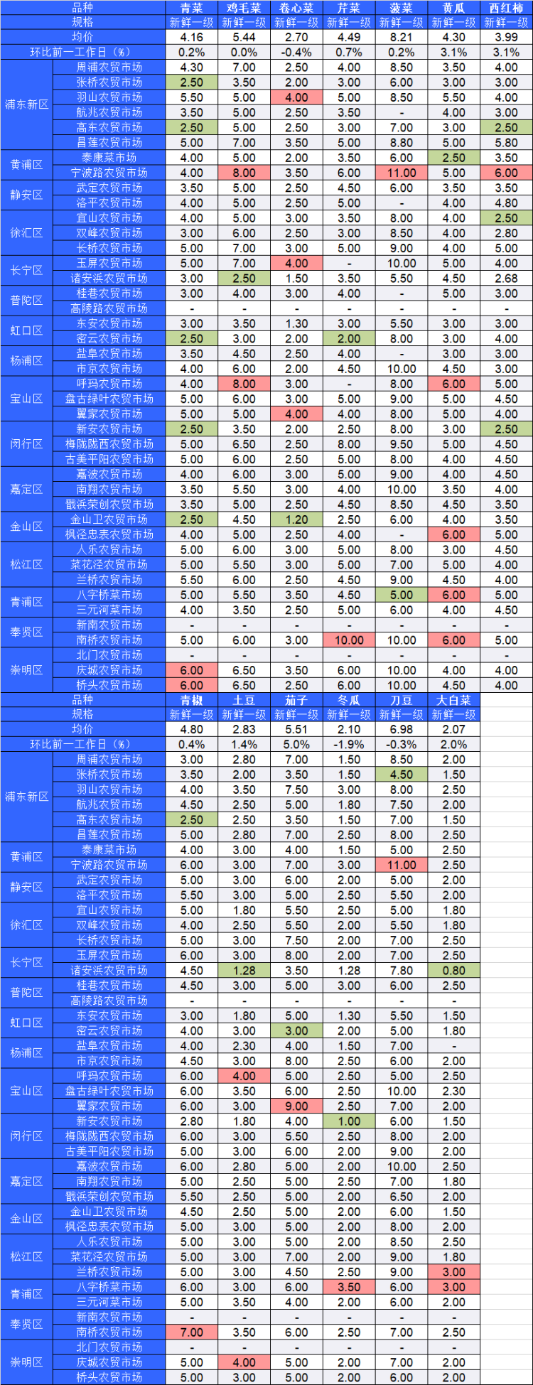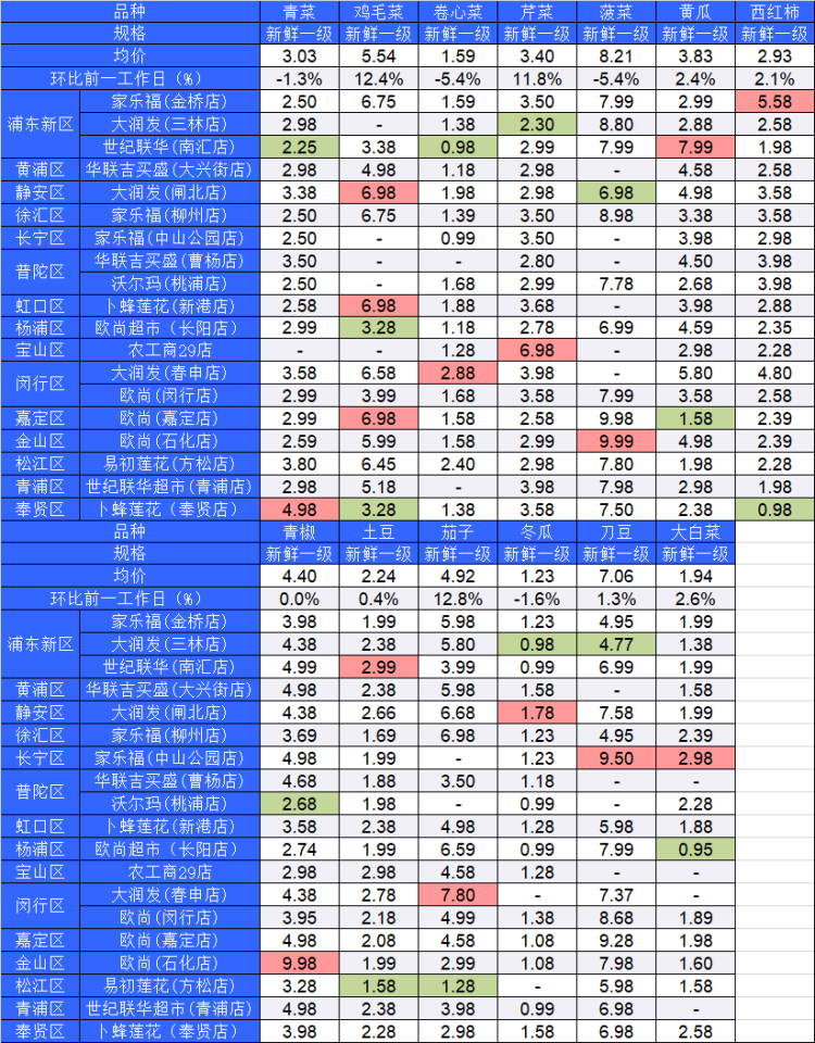 ■粉底标注代表该蔬菜品种在上述农贸市场或超市的最高价;绿底标注代表该蔬菜品种在上述农贸市场或超市的最低价