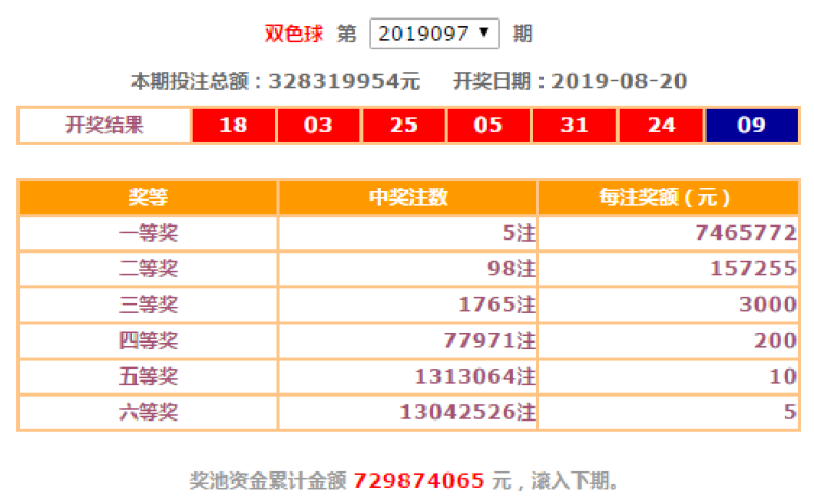 8月20日晚,中国福利彩票双色球游戏进行第2019097期开奖。当期双色球红球号码为03、05、18、24、25、31,蓝球号码为09。