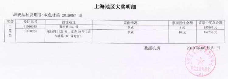 数据显示,上海彩民中得2注二等奖,单注奖金为157255元,彩票分别售出于黄河路239号、逸仙路1321弄1支弄39号(近吉浦路585号对面)福彩销售点。