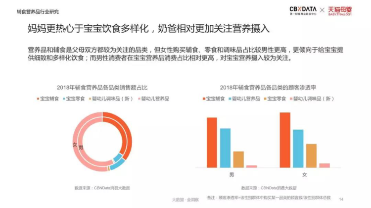 报告显示,宝妈重饮食多样化,奶爸更重“营养”。作为科学养娃意识日益提升的新晋宝爸宝妈们,自然不满足于“吃饱”,更要宝宝吃得健康营养,从身体内核上“赢在起跑线”。CBNData《报告》显示,2018年辅食营养品消费者中女性人数占比近八成,且在近三年间增幅持续提升。