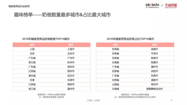 近日,第一财经商业数据中心(CBNData)发布了《辅食营养品行业趋势报告》,上海是全国奶爸最多的城市,其次为北京、广州、杭州等地。