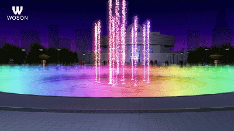 灯光系统在电脑程控下将灵活变换,映照出不同色彩的玻璃台阶;不锈钢镀钛红色处理喷泉格栅,回水孔饰以白玉兰主题镂空花纹。伴随着有节奏的音乐和灯光变幻,音乐喷泉以高低数码变频营造出变化多样的水幕效果。