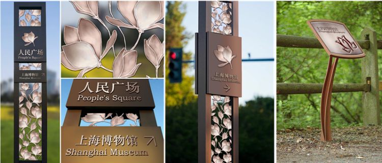 标识系统也将继续沿用市花“白玉兰”为元素,坐凳下沿增加条形LED灯带,提升夜景效果。颜色以经典的古铜色,玫瑰金为主色调,与周边环境相辅相成。新改造的挡土墙坐凳从实用出发,材质较之前耐用舒适,更美观。