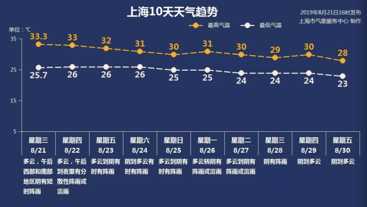 未来一段时间,上海仍然阵雨“天天见”。今天申城最高气温33.3℃,而本周剩余的日子最高气温或逐步走低,周日最高气温或在30℃左右。