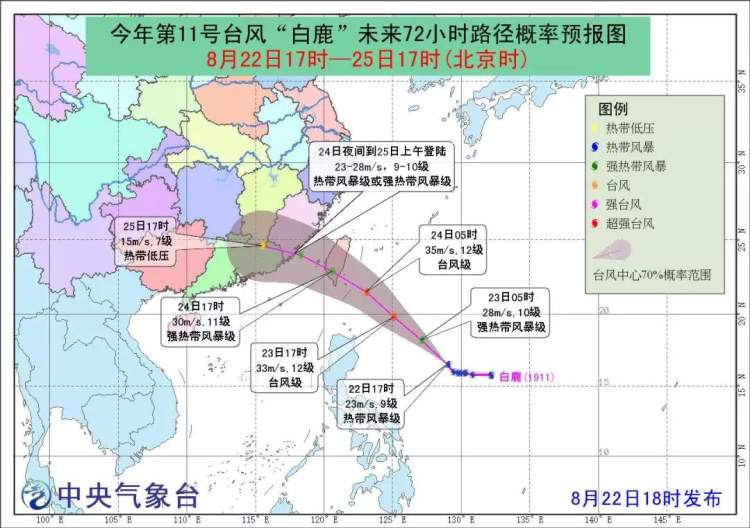 中央气象台发布台风预报,今年第11号台风“白鹿”将在24日白天登陆或擦过台湾岛东南部沿海,之后向粤闽沿海靠近。
