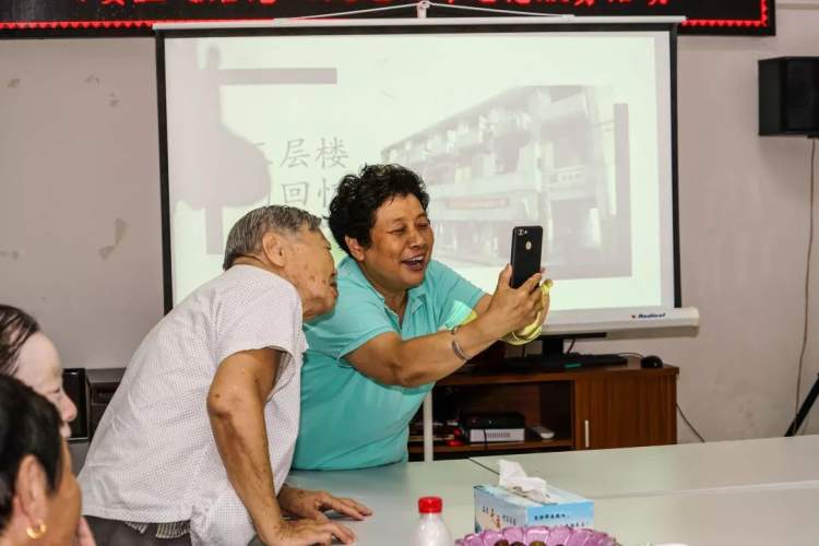三层楼经历了巨大的历史变迁,但老邻居们之间的情意却从未改变。65岁的周玉兰,曾是三层楼居民区的党总支书记,她也是活动上最活跃的人之一。她对大家说,今天有两位93岁的老邻居因故没有来,她准备录几段视频,发给二人看。于是,周玉兰在现场做起了“直播”,她介绍了现场的每一个老邻居,欢声笑语也都录了进去。