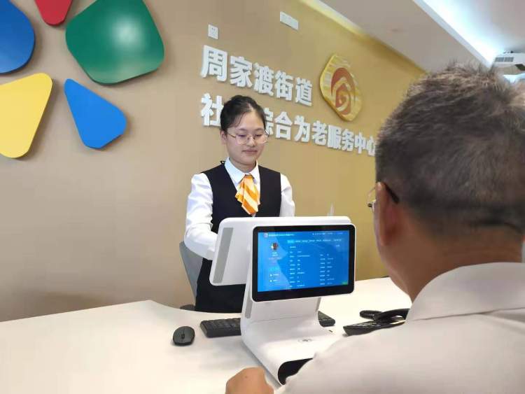 走进周家渡街道社区综合为老服务中心,一个迎宾机器人立即过来“打招呼”。