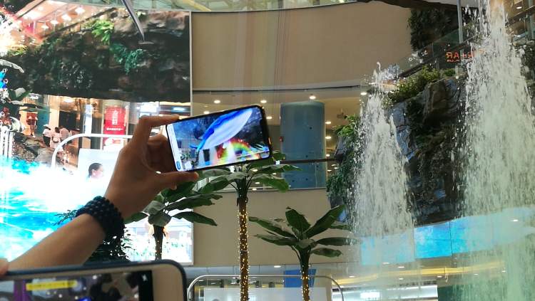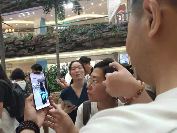 来到商场中庭,用手机APP往喷泉上方一扫,空中就出现了一头游动的大鲸鱼,还有嬉闹的水母群以及弯弯的彩虹桥。这是用AR技术与现有假山、喷泉以及周边装饰物品相结合打造的海底世界和动物乐园。