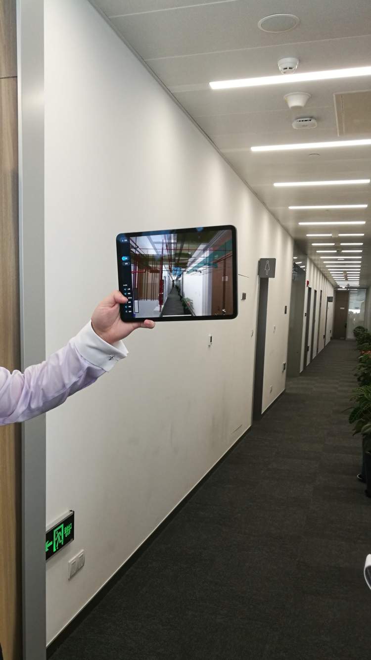 举起平板电脑,对着楼道,开始视觉识别,很快平板就变成了一块“透视镜”,通过它,使用者能将墙壁内部的隐蔽设备和管线看得清清楚楚。没错,运维助手就是这么“神奇”。