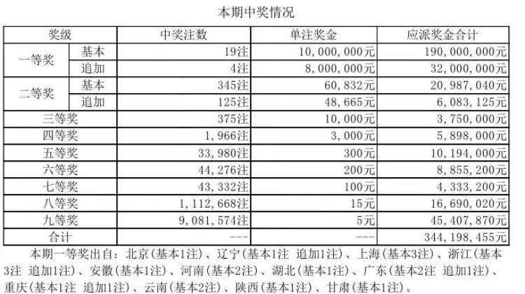 另据统计,本期二等奖中出345注,单注奖金6.08万元。其中125注为追加投注,每注多得奖金4.86万元。追加后,二等奖单注总奖金为10.94万元。