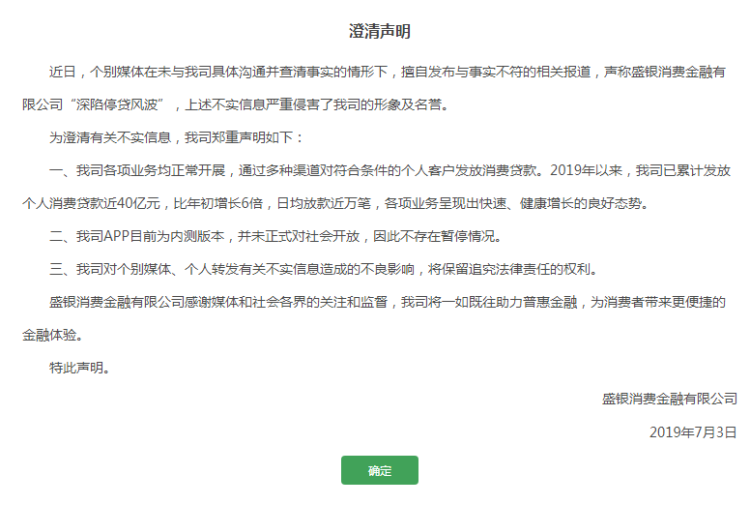而此前,盛银消费金融还一度深陷“停贷风波”,有报道称,盛银消费金融APP的“我的额度”、“商户分期”、“贷款申请”等入口均显示“暂未开通,敬请期待”。该公司客服称贷款项目均已暂停,正处于优化升级中。不过不久后盛银消费金融澄清称,其各项业务均正常开展,其APP目前为内测版本,并未正式对社会开放,不存在暂停情况。声明还指出,2019年以来盛银消费金融已累计发放个人消费贷款近40亿元,比年初增长6倍,日均放款近万笔。