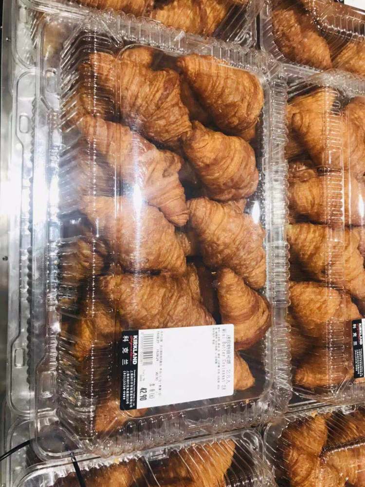 面包点心类也超受欢迎!28个一盒的可颂售价42.9元,爷叔思路清爽,马上报出1块5毛3的单价,连说便宜便宜,买回去当早饭。