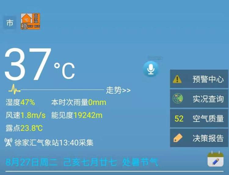 37℃!上海发布高温橙色额预警! 徐妍斐 2019-8-27 来源:周到上海 就在刚才的13时37分,上海中心气象台更新高温黄色预警信号为高温橙色预警信号。 受副热带高压影响,目前本市气温正快速上升,预计中心城区和浦东中北部地区今天的最高气温将达到37℃,高温黄色预警信号更新为高温橙色预警信号。 目前,本市的实时气温已经达到了37℃。 而上一次上海达到37℃酷暑线的还是7月30日,距今已经快要一个月了。 这也是申城今夏第11个高温日,第4个酷暑日。 来源:周到上海 作者:徐妍斐 赞一个 (0)