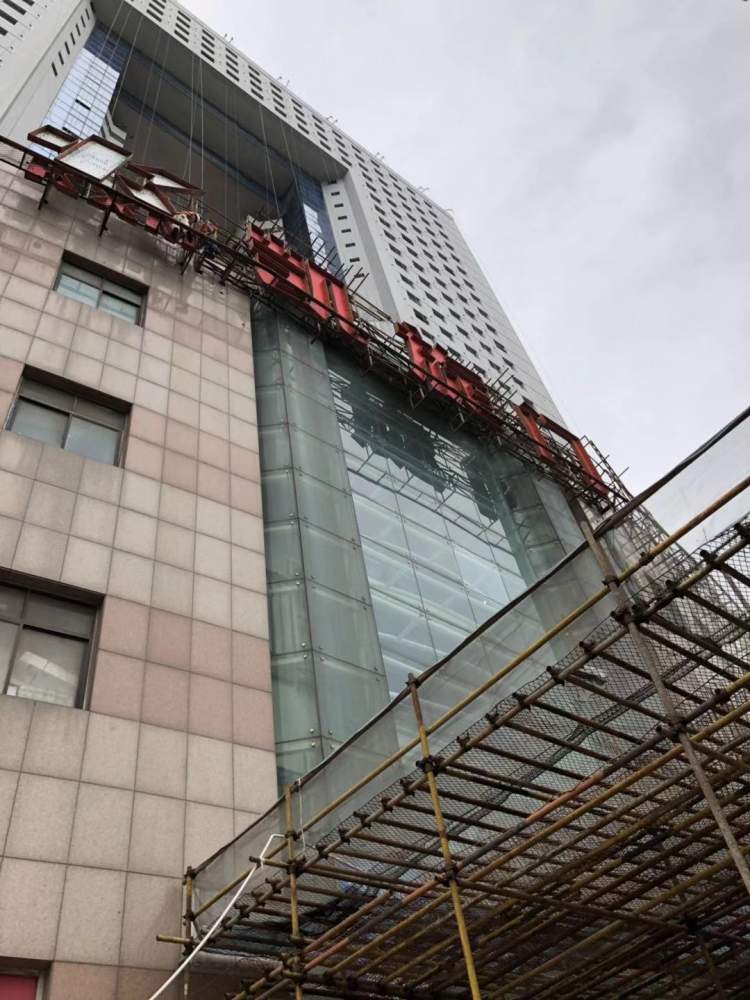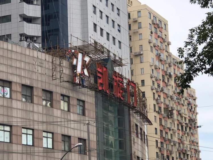 周到君在凯旋门大楼现场看到,施工脚手架已经搭建起来,工人正在对招牌进行拆除。据北站街道城管中队有关负责人介绍,这块招牌高度有4米,长60米,体量非常巨大,通过钢铁框架固定在大楼外立面,但由于年代久远,部分结构锈蚀,此前已经有市民反映过其存在安全隐患。