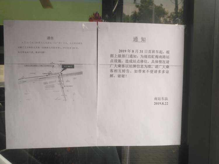 记者看到,行驶在虹梅南路的729路公交车的车门上贴出一张通告,上面写着: 8月31日起,729路往上海南站(北广场)方向,龙吴路放鹤路站搬迁至放鹤路龙吴路(放鹤路龙吴路西侧),步行距离280米。
