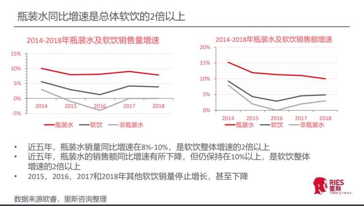 欧睿数据显示,中国瓶装水市场从2014年的316亿升,到2018的434亿升,平均增长率8%,销量已接近整个软饮市场的一半;销售额从2014年的1145亿元增至2018年1743亿元,占整个软饮市场的三成。