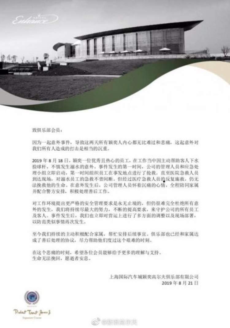 ▲事发后,上海国际汽车城颖奕高尔夫俱乐部有限公司写给会员的内部信函