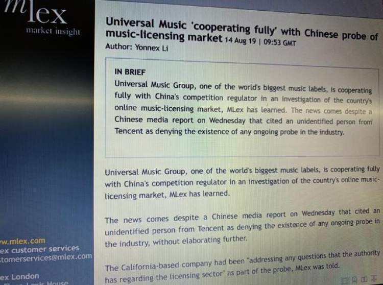 反垄断监管机构很早就注意到这件事,并于今年1月份展开大规模调查,向相关唱片公司和依赖腾讯独家音乐版权转授的阿里巴巴、网易、字节跳动等公司发起了传唤调查。本月中,环球唱片接受了相关部门的问询。该消息的来源,是一位社交平台用户曝出的来自法律咨询机构Mlex market insight的报告截图。