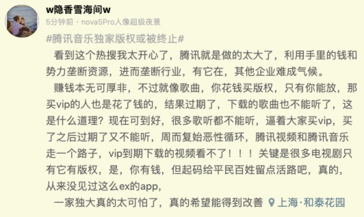 通过鲸吞版权,以及限制其他平台获取优质资源,腾讯音乐让用户弃用网易云音乐、虾米音乐等平台,转而使用自己旗下的平台,这不仅仅是垄断,也剥夺了用户选择的权利。