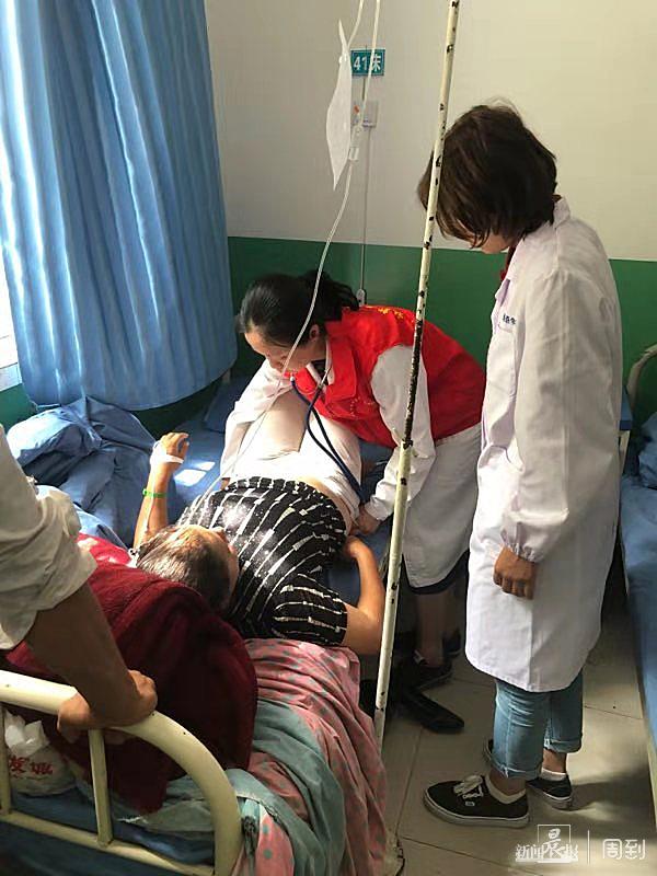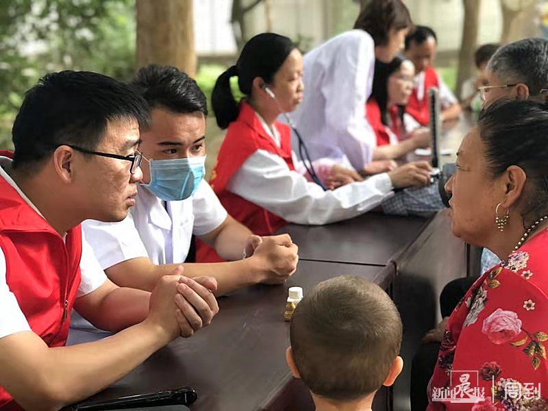 当天的温度高达34度,在卫生院的广场上,从上午11点到下午6点,4位上海医生摆摊义诊了300多名病人。