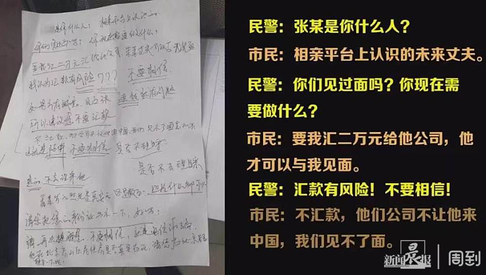 “和张某一直是微信文字聊天,没见过面?”为了进一步确认王阿姨遇到了电信诈骗,周小宇继续在纸上与她沟通:“他的公司具体名称不知道?国外负责什么项目也不清楚?”